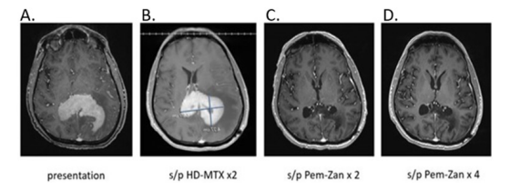 Figure 1:Brain MRI W/WO contrast of a 60-year-old male with PCNSL. Figure 1A was obtained at presentation; Figure 1B shows persistent PCNSL following 2 cycles of HD-MTX. The final two images reveal radiographic improvement after 2 (Figure 1C) and 4 (Figure 1D) cycles of Pem-Zan, respectively.