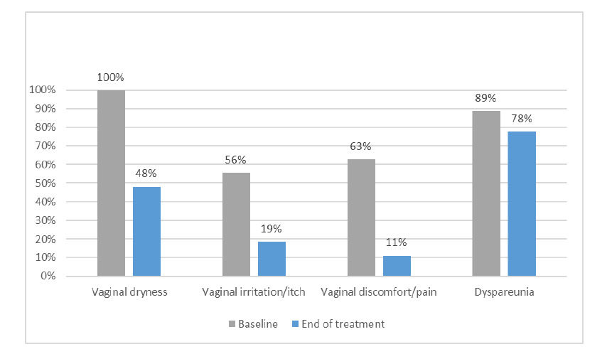 Figure 1.Baseline vs end of treatment patient reported Genitourinary Symptoms of Menopause (GSM)